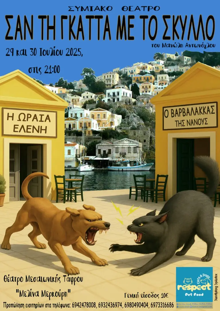 Τρίτη, 29 Ιουλίου, ξεκινά και το Συμιακό Θέατρο, “Σαν την γκάττα με τον σκύλλο”, επίσης για δύο παραστάσεις.