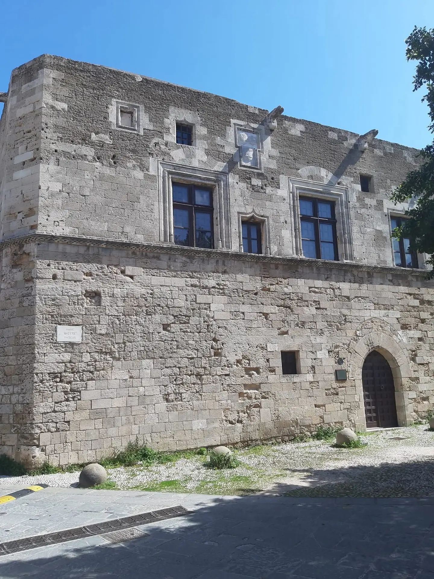 Το συγκρότημα απλωνόταν σε δύο τμήματα πάνω από θολωτό δρομάκι κάθετο της ιστορικής οδού Ιπποτών που επικοινωνούσαν λειτουργικά μεταξύ τους. Πλήγηκε σημαντικά από την πολιορκία του Μωάμεθ, το 1480 και από τον σεισμό του 1481, και ανακατασκευάστηκε στα 1514, όπως μαρτυρούσε η επιγραφή που ήταν πλήρως ορατή μέχρι τις αρχές του περασμένου αιώνα, στο υπέρθυρο της αναγεννησιακής πόρτας εισόδου που οδηγεί στην αυλή του. Ο όροφος ανακατασκευάστηκε πλήρως κατά την περίοδο της ιταλοκρατίας, καθώς πλήγηκε από την έκρηξη της οθωμανικής πυριτιδαποθήκης στην εκκλησία του Αγ. Ιωάννη, στη σημερινή οδό Παναιτίου, το 1856, και τον σεισμό που ακολούθησε το 1863.