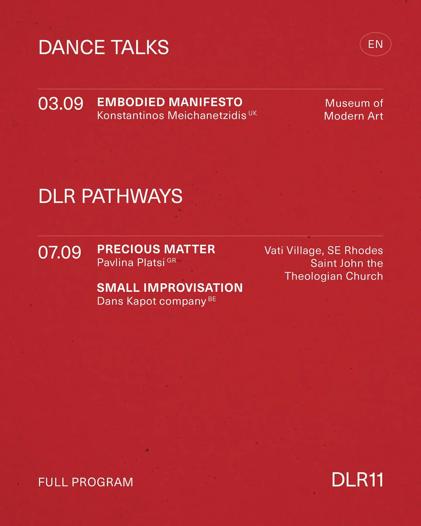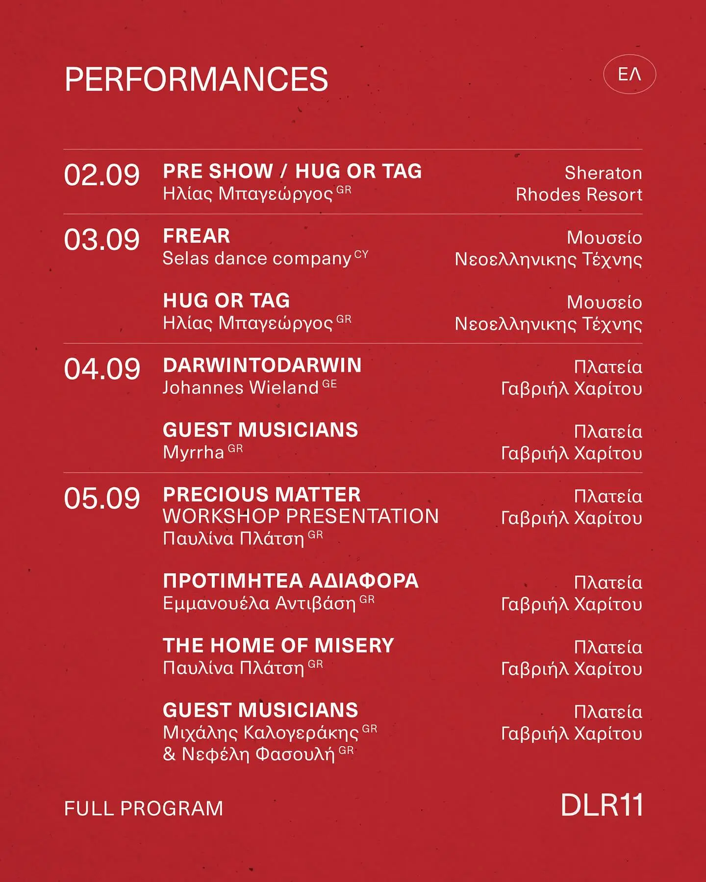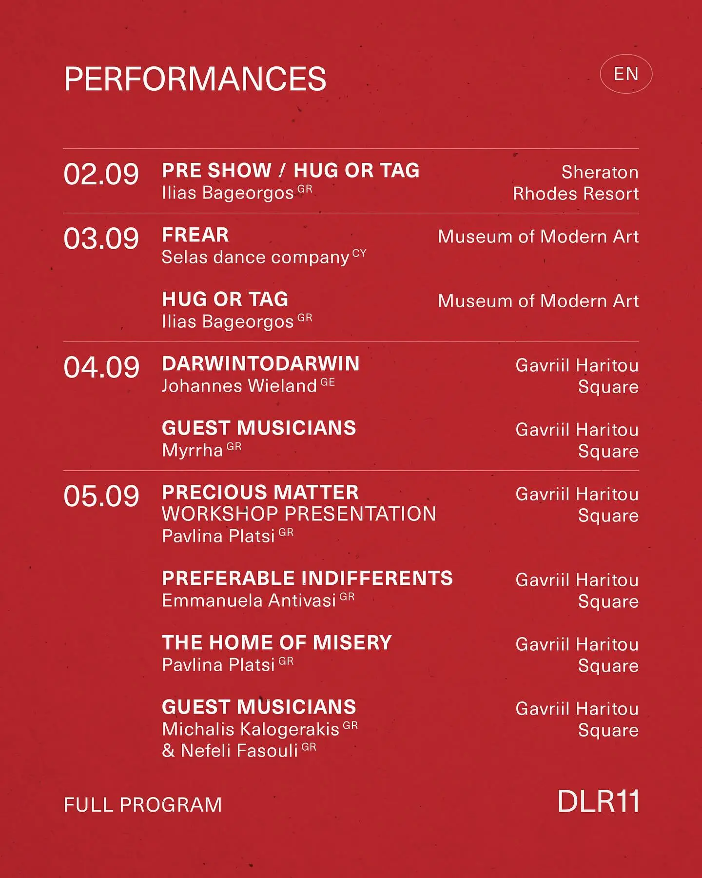 Το Dance Laboratory Rhodes – DLR με ιδιαίτερη χαρά ανακοινώνει την 11η επέτειο του ετήσιου Διεθνούς Φεστιβάλ Σύγχρονου Χορού της Ρόδου, με γενικότερο τίτλο «Move to feel, feel to become» ( μτφρ. «Κινήσου μέχρι να Νιώσεις, Νιώσε μέχρι να Γίνεις»), το οποίο θα πραγματοποιηθεί από τις 2 έως τις 10 Σεπτεμβρίου 2025. Ανοίγοντας και πάλι τους χρόνους του και το βήμα του, για να ανταμώσει νέες συνειδήσεις, νέους βηματισμούς και νέα κίνηση, το DLR11 και στο πλαίσιο της εξωστρέφειας του Σύγχρονου Πολιτισμού , και ειδικότερα του Σύγχρονου Χορού, έθεσε ως στόχο για φέτος το αντάμωμα πολιτισμών, βιωμάτων, βηματισμών, είτε ως ατομικών ταυτοτήτων είτε ως συλλογικών/ συμπαντικών συνειδήσεων αλλά και την αποτύπωση ασυνείδητων μηχανισμών Ύπαρξης ή Ανυπαρξίας.