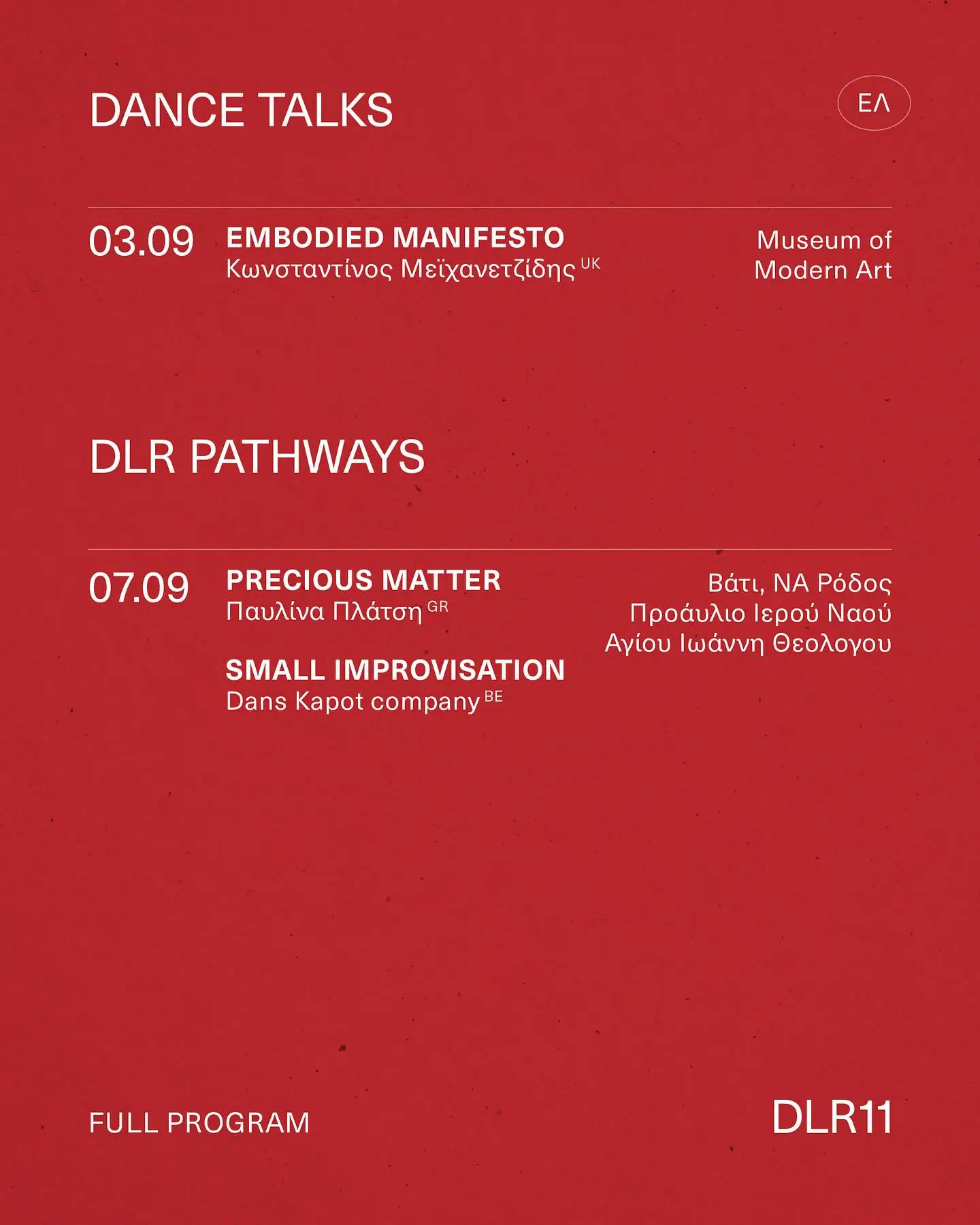 Το θέμα του Φετινού DLR11 : Το Θέμα του Φετινού DLR11 αφορά στη στενή αλληλεπίδραση «Ανθρώπου- Χορευτή» και Περιβάλλοντος, στην αέναη κίνηση διαμόρφωσης της ταυτότητας του Σύγχρονου Ανθρώπου μέσα από το πέρασμά του από τόπο σε τόπο, από νησί σε νησί της Δωδεκανήσου. Πώς θα μπορούσε να απουσιάζει η ζωοδοτική σχέση της Μαρίας Μανουκιάν με τον Τόπο της, το νησί της Ρόδου και τα Δωδεκάνησα από το Φετινό Φεστιβάλ; Και πώς, την ίδια στιγμή, θα μπορούσε να απουσιάζει η «οικουμενικότητα της ανθρώπινης Ύπαρξης και Ψυχής»