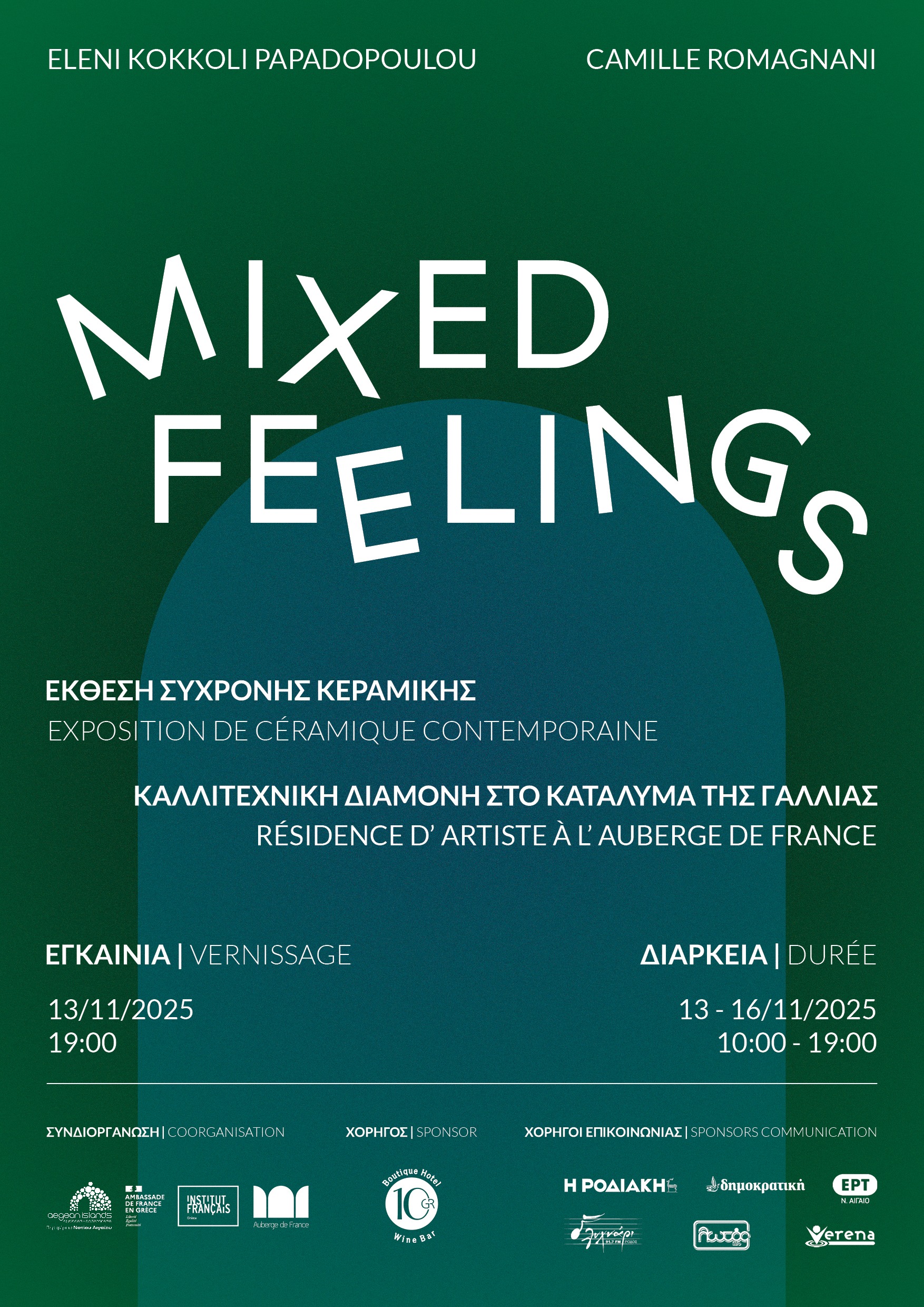 Το Κατάλυμα της Γαλλίας φιλοξενεί την έκθεση σύγχρονης κεραμικής «Mixed Fillings» των καλλιτέχνιδων Ελένη Κοκκώλη Παπαδοπούλου (Ελλάδα) και Camille Romagnani (Γαλλία), με την οποία ολοκληρώνεται το πρόγραμμα της 7ης Καλλιτεχνικής Διαμονής Σύγχρονης Κεραμικής Τέχνης για το 2025.