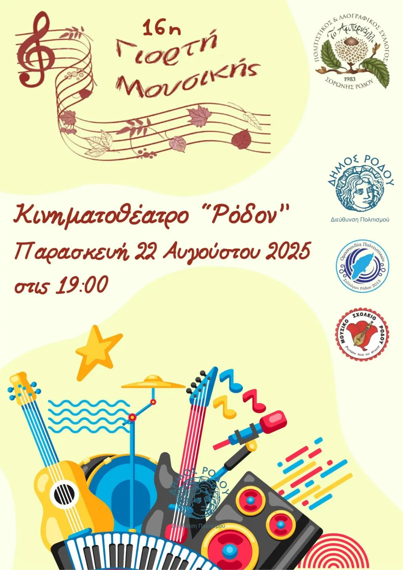 Την Παρασκευή 22 Αυγούστου, στο Ανοικτό Κινηματοθέατρο «Ρόδον» από τις 19:00, η καρδιά της Ρόδου θα χτυπήσει στον παλμό της μουσικής, σε μια βραδιά γεμάτη ρυθμό, μελωδία και ζωντανή ατμόσφαιρα.