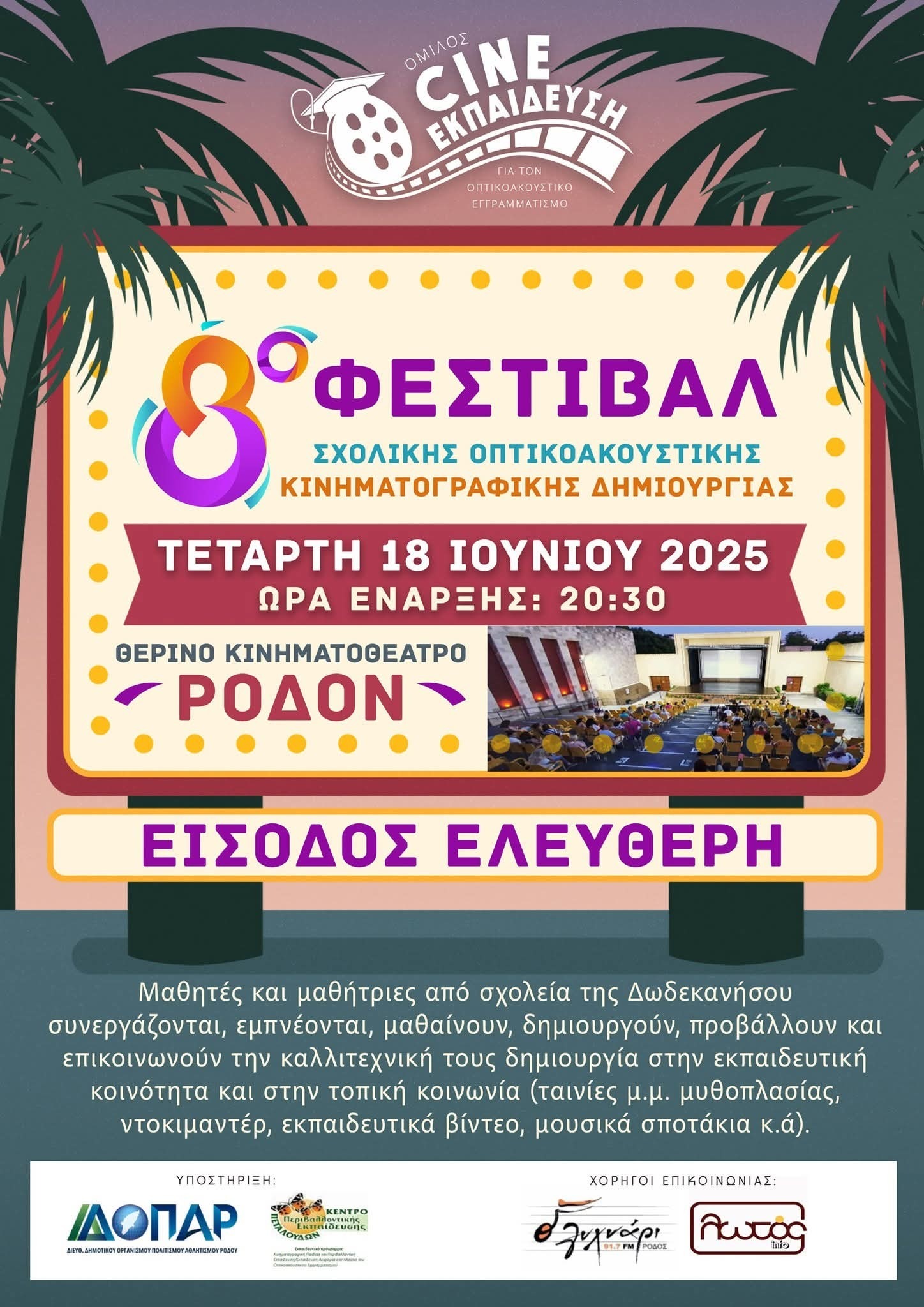 Το πρόγραμμα του φεστιβάλ, περιλαμβάνει προβολή οπτικοακουστικού μαθητικού υλικού (ταινίες μικρού μήκους μυθοπλασίας, ντοκιμαντέρ, εκπαιδευτικά βίντεο, μουσικά σποτάκια κ.ά.), δημιουργικές καλλιτεχνικές δραστηριότητες από12 κινηματογραφικές ομάδες σχολικών μονάδων Α/θμιας & Β/θμιας Εκπαίδευσης Δωδεκανήσου. Πριν τις προβολές οι δημιουργοί, μαθητές/μαθήτριες και εκπαιδευτικοί, θα παρουσιάσουν με λίγα λόγια την καλλιτεχνική τους δημιουργία.