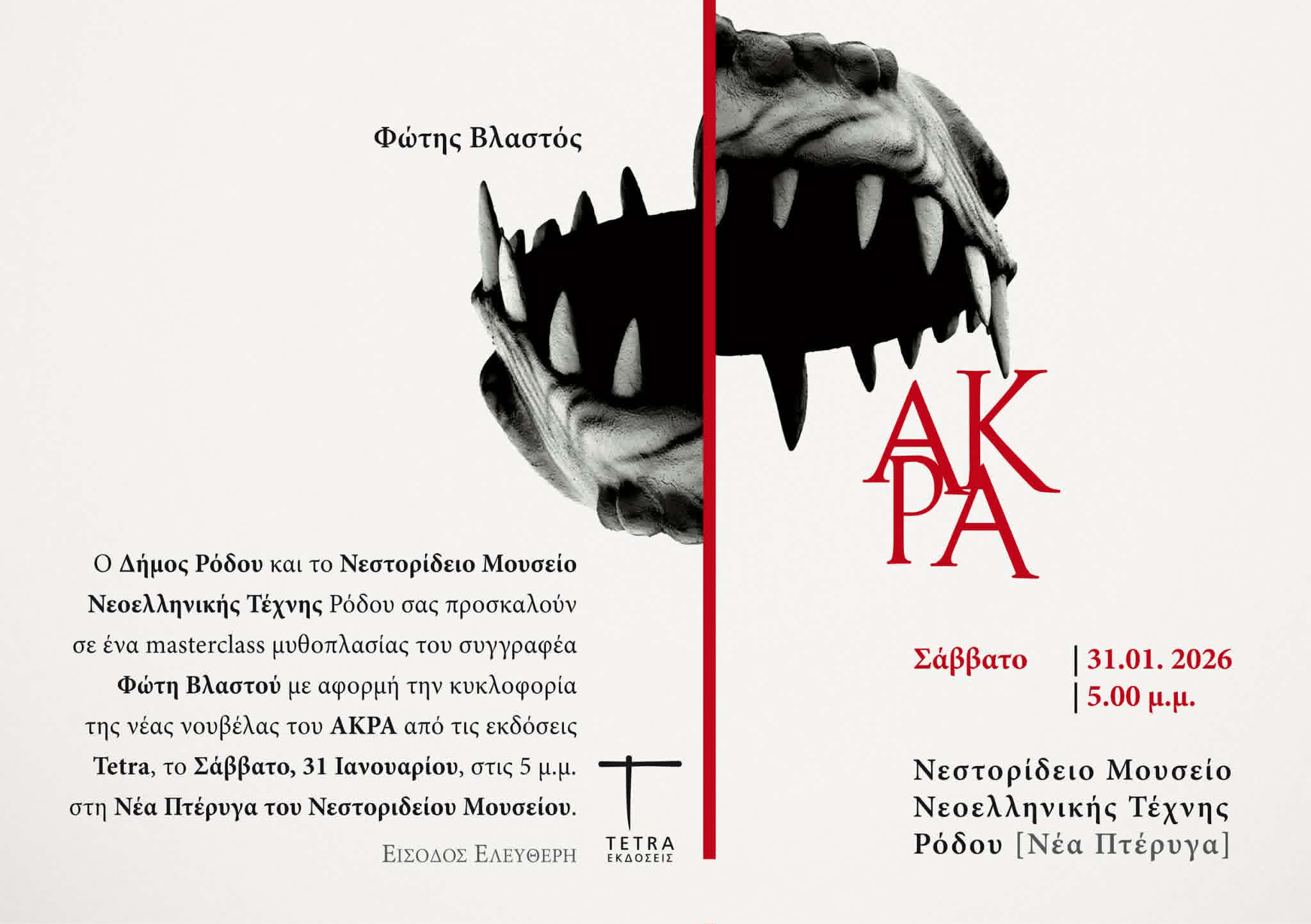 Ο Δήμος Ρόδου και το Νεστορίδειο Μουσείο Νεοελληνικής Τέχνης Ρόδου σάς προσκαλούν σε μια ξεχωριστή λογοτεχνική εμπειρία. Με αφορμή την κυκλοφορία της νέας του νουβέλας «ΑΚΡΑ» από τις εκδόσεις Tetra, ο συγγραφέας Φώτης Βλαστός θα παραδώσει ένα masterclass μυθοπλασίας.