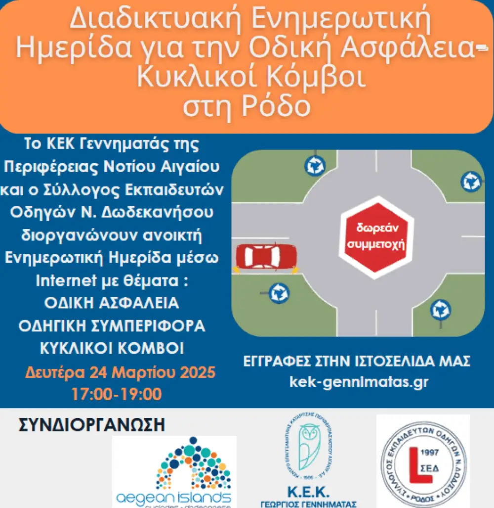 Το ΚΕΚ Γεννηματάς της Περιφέρειας Νοτίου Αιγαίου και ο Σύλλογος Εκπαιδευτών Οδηγών Ν. Δωδεκανήσου διοργανώνουν ανοικτή Ενημερωτική Ημερίδα μέσω Internet με θέματα :