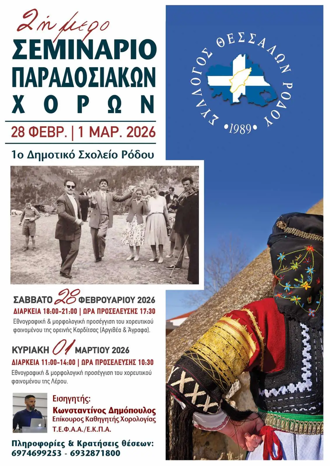 Ο Σύλλογος Θεσσαλών Ρόδου έχει την τιμή να σας προσκαλέσει σε διήμερο σεμινάριο παραδοσιακών χορών, με εισηγητή τον