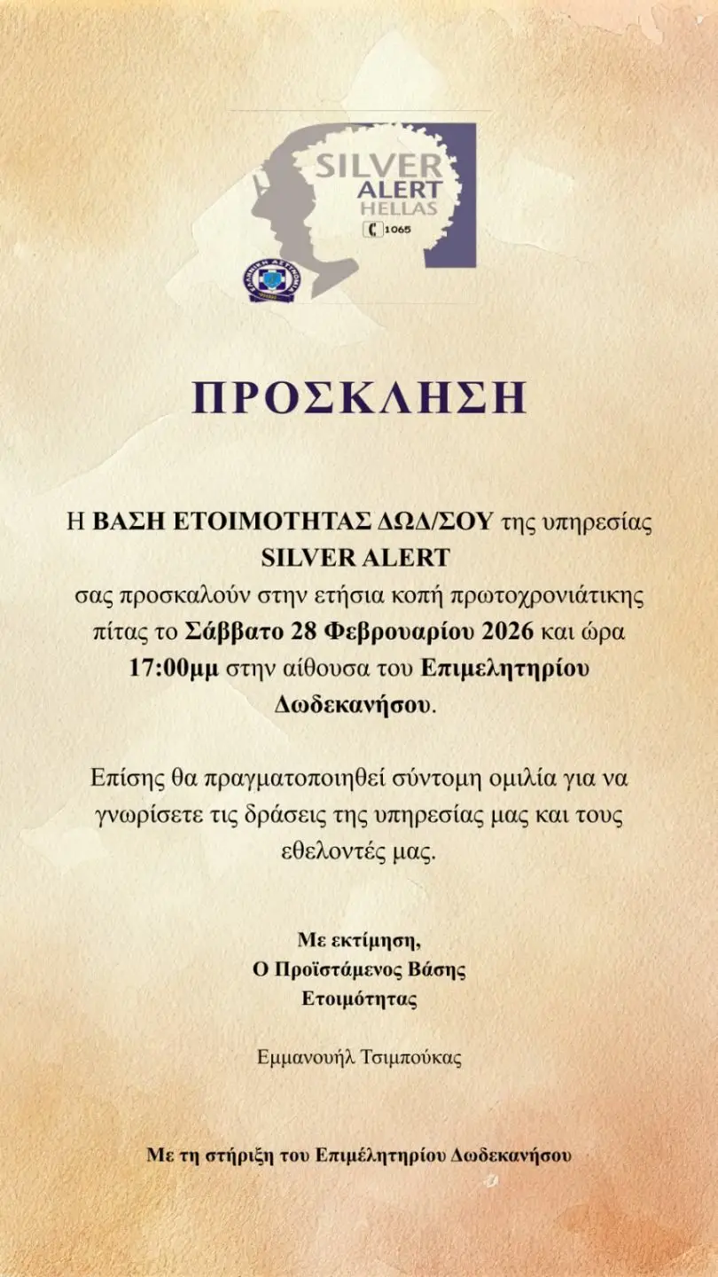 Η Βάση Ετοιμότητας Δωδεκανήσου, της Υπηρεσίας Silver Alert Hellas, απευθύνει ανοικτή πρόσκληση προς κάθε ενδιαφερόμενο για την παρουσία του σε εκδήλωση ενημερωτικού χαρακτήρα σχετικά με το έργο και τις δράσεις της Υπηρεσίας.
