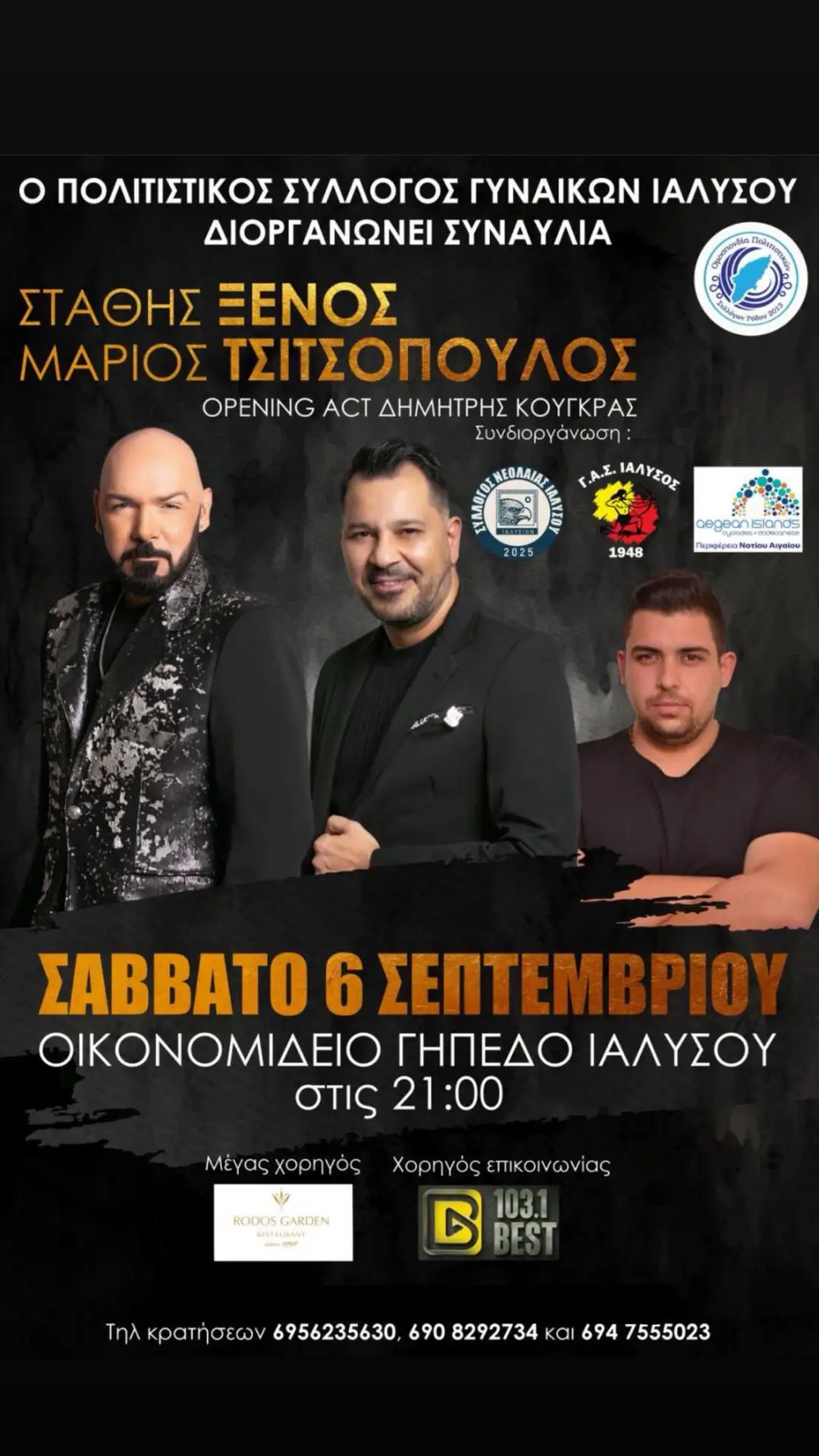 Ο Πολιτιστικός Σύλλογος Γυναικών Ιαλυσού σας προσκαλεί σε μια αξέχαστη μουσική βραδιά με τον δημοφιλή τραγουδιστή Στάθη Ξένο, το Σάββατο 6 Σεπτεμβρίου, στις 9:00 μ.μ., στο Οικονομίδειο Γήπεδο Ιαλυσού.