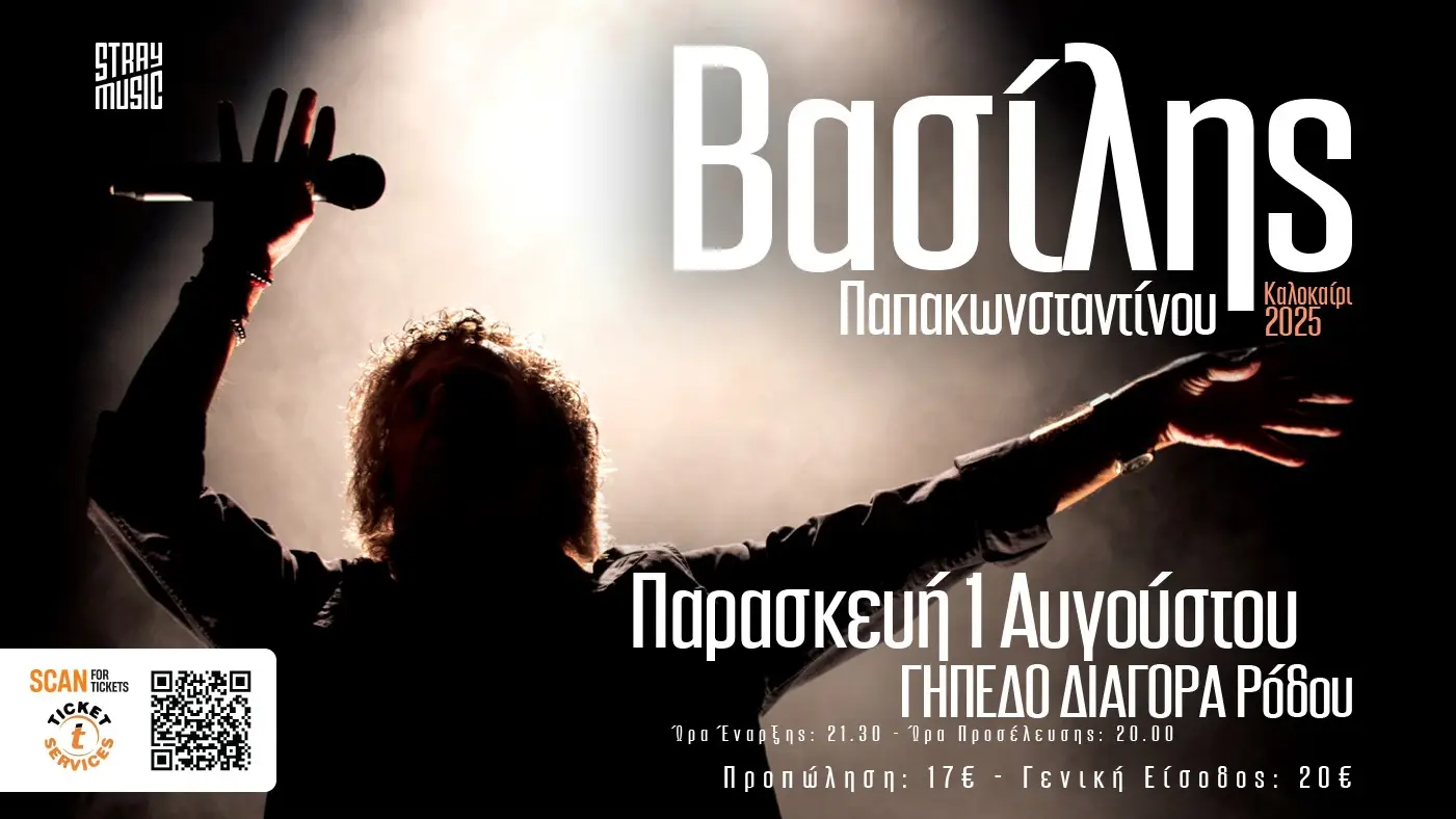 Προπώληση: https://www.ticketservices.gr/event/vasilis-papakonstantinou-rodos-2025/?lang=el