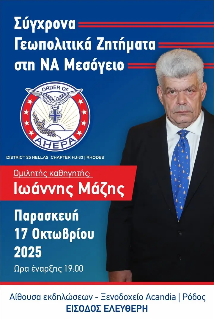 Με ιδιαίτερη χαρά και τιμή υποδεχόμαστε τον καθηγητή Δρ. Ιωάννη Μάζη, έναν από τους πλέον διακεκριμένους Έλληνες γεωπολιτικούς αναλυτές και ακαδημαϊκούς σε μια εκδήλωση/ομιλία για τα φλέγοντα γεωπολιτικά ζητήματα στη νοτιοανατολική Μεσόγειο.