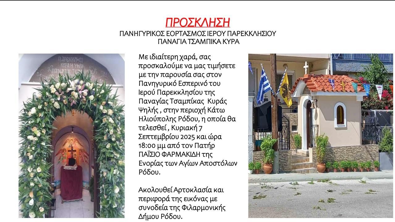 Ο εσπερινός θα τελεστεί την Κυριακή 7 Σεπτεμβρίου 2025 και ώρα 18:00, στην περιοχή Κάτω Ηλιούπολης Ρόδου. Την ακολουθία θα τελέσει ο Πατήρ Παΐσιος Φαρμακίδης της Ενορίας των Αγίων Αποστόλων Ρόδου.