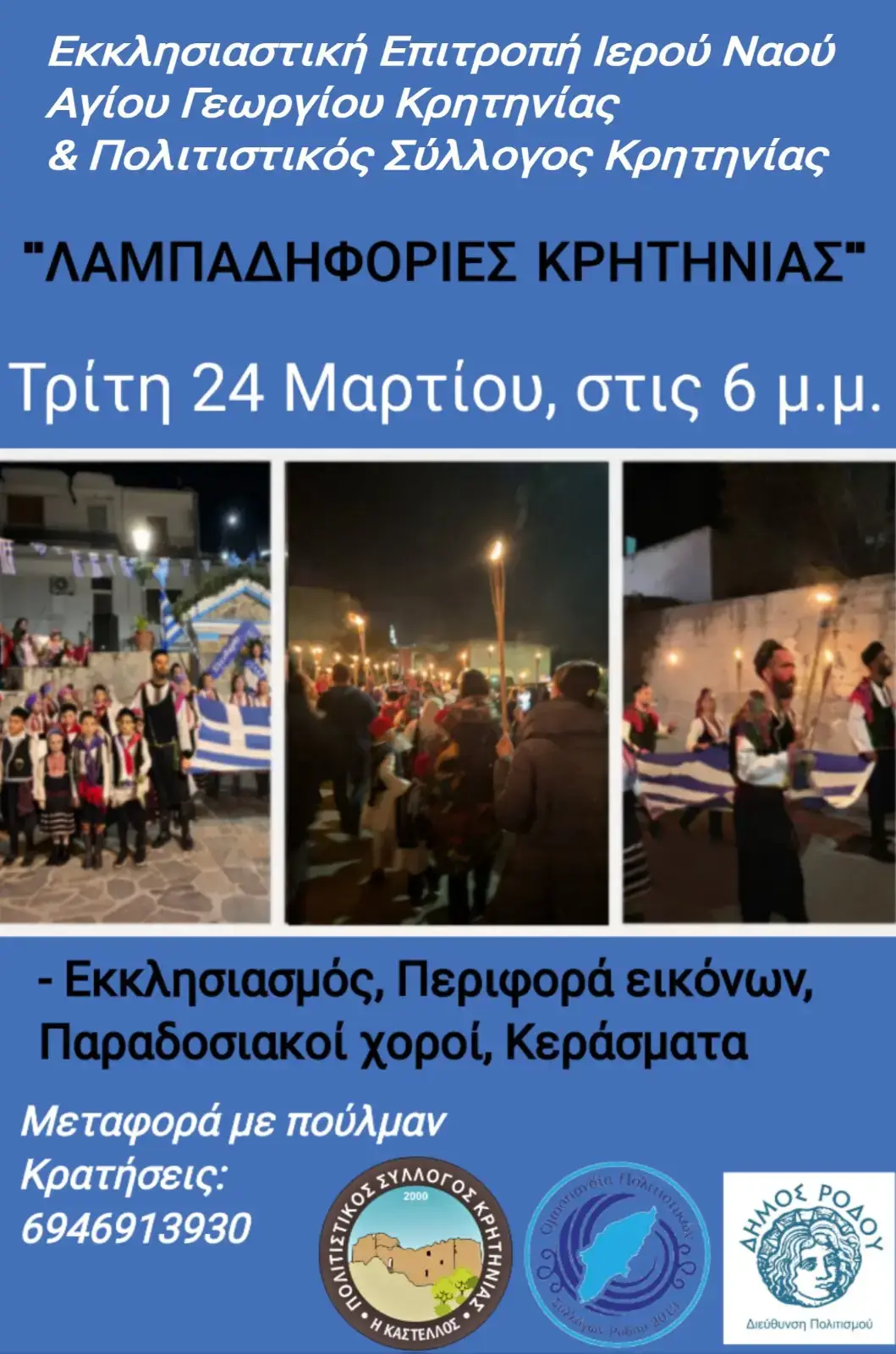 Η Εκκλησιαστική Επιτροπή του Ιερού Ναού Αγίου Γεωργίου Κρητηνίας και ο Πολιτιστικός Σύλλογος Κρητηνίας σάς προσκαλούν στις καθιερωμένες «Λαμπαδηφορίες Κρητηνίας».