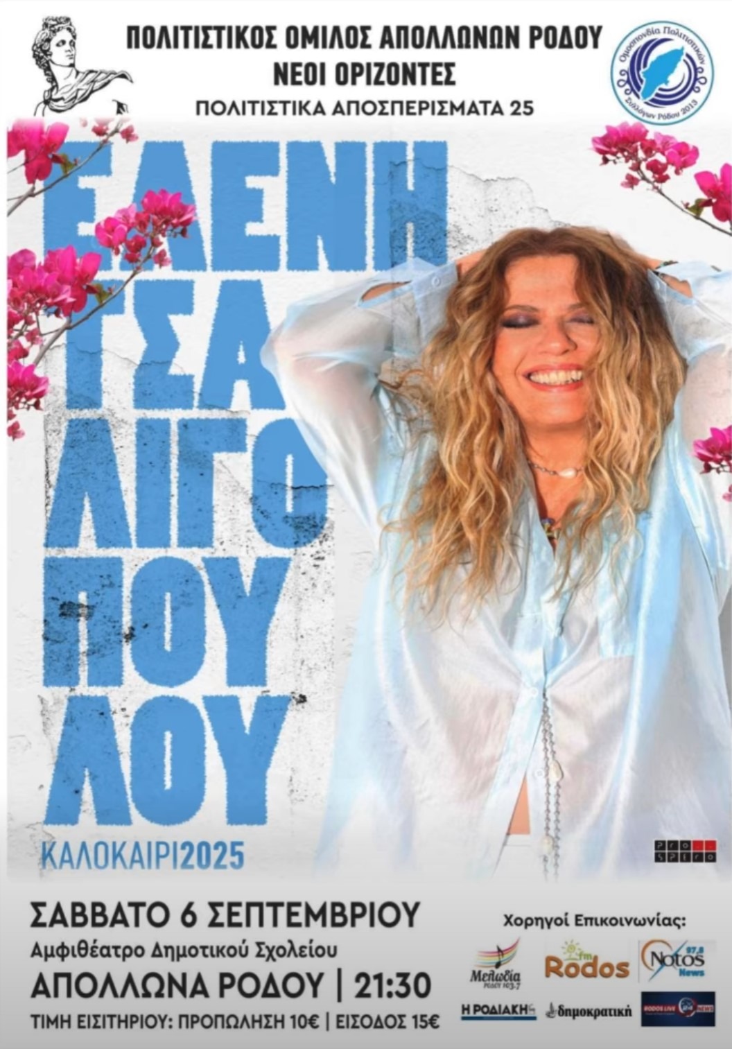 Ο Πολιτιστικός Όμιλος Απόλλων Ρόδου – Νέοι Ορίζοντες, στο πλαίσιο των Πολιτιστικών Αποσπερισμάτων 25, διοργανώνει μια μοναδική συναυλία με την καταξιωμένη ερμηνεύτρια Ελένη Τσαλιγοπούλου.