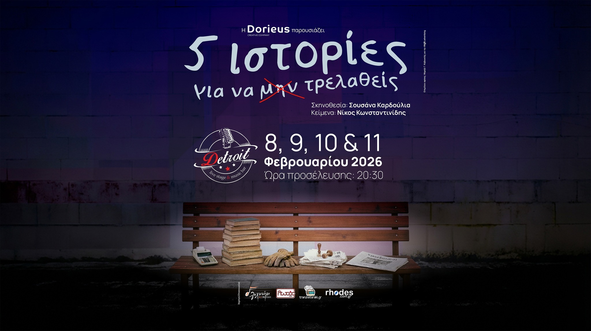 Η Dorieus Creative Company παρουσιάζει τη θεατρική παράσταση «5 ιστορίες για να (μην) τρελαθείς», σε σκηνοθεσία Σουσάνας Καρδούλια και κείμενο Νίκου Κωνσταντινίδη, για τέσσερις μοναδικές παραστάσεις στο Detroit Live Stage & Music Bar (Καποδιστρίου 20, Ρόδος), στις 8, 9, 10 και 11 Φεβρουαρίου 2026.