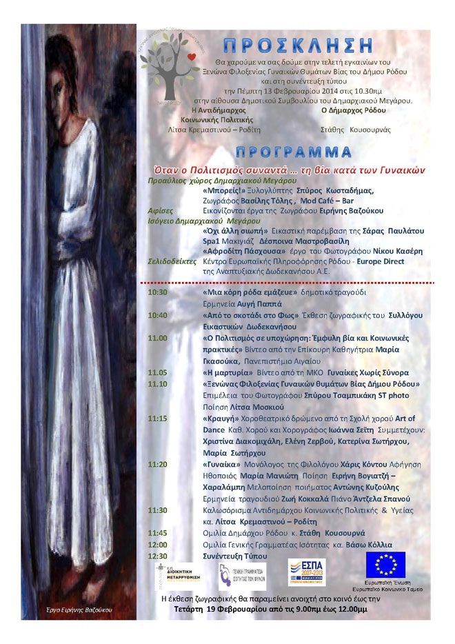 Θα χαρούμε να σας δούμε στην τελετή των εγκαινίων του Ξενώνα Φιλοξενίας Γυναικών Θυμάτων βίας Δήμου Ρόδου θα πραγματοποιηθεί την Πέμπτη 13 Φεβρουαρίου, 10:30, στο Δημαρχιακό Μέγαρο Δήμου Ρόδου. Η είσοδος είναι ελεύθερη. Η αντιδήμαρχος Κοινωνικής Πολιτικής […]