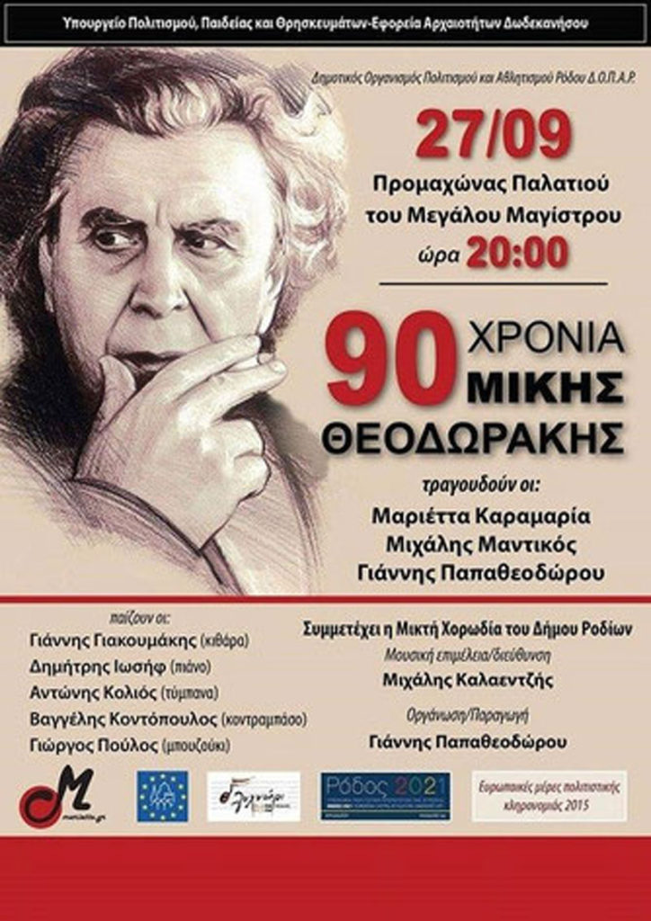 Το Υπουργείο Πολιτισμού και Θρησκευμάτων – Εφορεία Αρχαιοτήτων Δωδεκανήσου και ο Δημοτικός Οργανισμός Πολιτισμού Αθλητισμού Ρόδου σας προσκαλούν στη συναυλία αφιερωμένη στα 90 χρόνια από τη γέννηση του Μίκη Θεοδωράκη, που θα πραγματοποιηθεί στον Προμαχώνα του Παλατιού του Μεγάλου Μαγίστρου, την Κυριακή 27 Σεπτεμβρίου και ώρα 20:00. Η συναυλία γίνεται στα πλαίσια των ημερών πολιτισμού και […]
