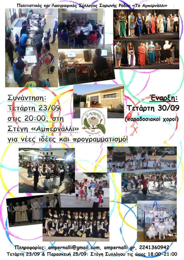 Ο Πολιτιστικός και Λαογραφικός Σύλλογος Σορωνής Ρόδου «Το Αμπερνάλλι» ξεκινά και πάλι τις πρόβες και τις ομάδες του από την Τετάρτη 30 Σεπτεμβρίου (με τις ομάδες παραδοσιακών χορών). Την Τετάρτη 23 Σεπτεμβρίου στις 20:00 θα γίνει συνάντηση όσων ενδιαφέρονται για τις ομάδες αυτές, καθώς και για νέες προτάσεις, οργάνωση και επανεκκίνηση. Η Στέγη του Συλλόγου […]