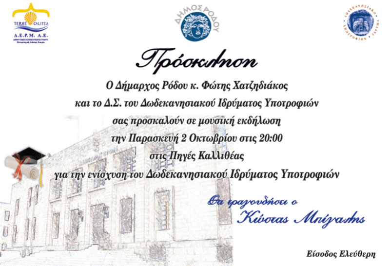 Θα ήταν ιδιαίτερη τιμή για μας αν όλοι εσείς οι παλιοί υπότροφοι του Δωδεκανησιακού Ιδρύματος Υποτροφιών πηγές Καλλιθέας από το 1979 έως σήμερα, μας τιμούσατε με την παρουσία σας στην εκδήλωση που διοργανώνουμε την Παρασκευή 2 Οκτωβρίου και ώρα 20:00 στις πηγές Καλλιθέας, για τη στήριξη των δράσεων του Ιδρύματος.