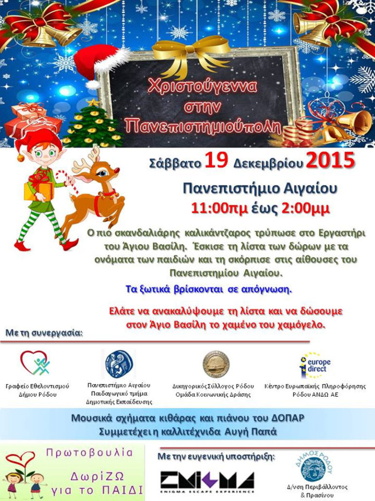 «Ο πιο σκανδαλιάρης καλικάντζαρος τρύπωσε στο Εργαστήρι του Άγιου Βασίλη. Έσκισε τη λίστα των δώρων με τα ονόματα των παιδιών και τη σκόρπισε στις αίθουσες του Πανεπιστημίου Αιγαίου. Τα ξωτικά βρίσκονται σε απόγνωση. Ελάτε να ανακαλύψουμε τη λίστα και να δώσουμε στον Άγιο Βασίλη το χαμένο του χαμόγελο». Μια διαφορετική και πρωτότυπη εκδήλωση υπόσχεται η […]