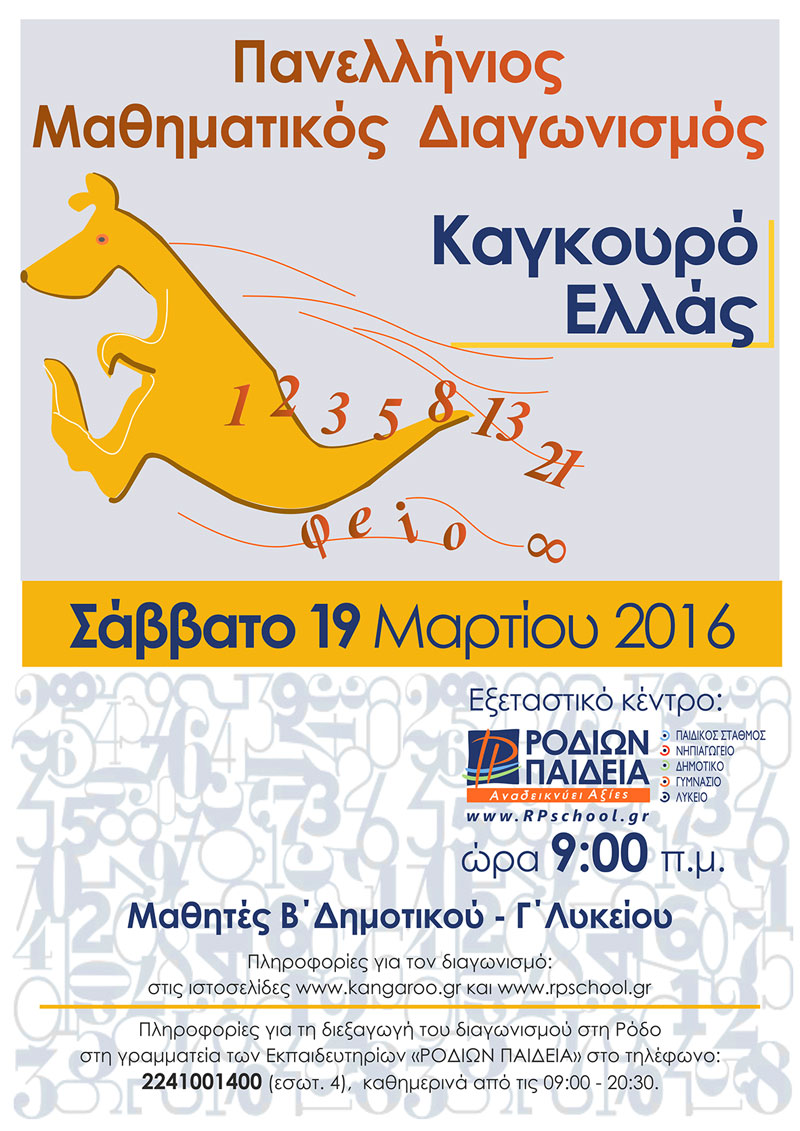 Αναλυτικές πληροφορίες για το διαγωνισμό μπορείτε να αναζητήσετε στις ιστοσελίδες www.kangaroo.gr. και www.rpschool.gr ή επικοινωνήστε τηλεφωνικά με τη γραμματεία των Εκπαιδευτηρίων «ΡΟΔΙΩΝ ΠΑΙΔΕΙΑ» στο τηλέφωνο 2241001400 εσωτερικό 4 από τις 9:00 – 20:30 (καθημερινά) και 09:00 – 14:00 (Σάββατο). Επίσης, μπορείτε να επικοινωνήσετε ηλεκτρονικά στη διεύθυνση kangaroo@rpschool.gr