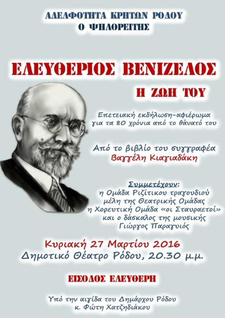Η Αδελφότητα Κρητών Ρόδου « ο Ψηλορείτης » πραγματοποιούν επετειακή εκδήλωση-αφιέρωμα για τα 80 χρόνια από το θάνατο του Ελευθέριου Βενιζέλου. Κυριακή 27 Μαρτίου 2016. Δημοτικό Θέατρο Ρόδου, ώρα 20:30 μ.μ. Είσοδος ελεύθερη