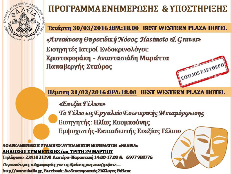 Ο κύκλος των προγραμμάτων Ενημέρωσης & Υποστήριξης για τα αυτοάνοσα νοσήματα και τις χρόνιες παθήσεις, με την συμμετοχή ιατρών και ειδικευμένων θεραπευτών, συνεχίζετε από τον Δωδεκανησιακό Σύλλογο Αυτοάνοσων Νοσημάτων Αρθρίτιδας & Λύκου «ΘΑΛΕΙΑ». Με δύο συναντήσεις την προσεχή εβδομάδα, με ΕΛΕΥΘΕΡΗ ΕΙΣΟΔΟ. Τετάρτη 30 Μαρτίου 2016 ΩΡΑ: 18.00 BEST WESTERN PLAZA HOTEL Με θέμα «Αυτοάνοση […]