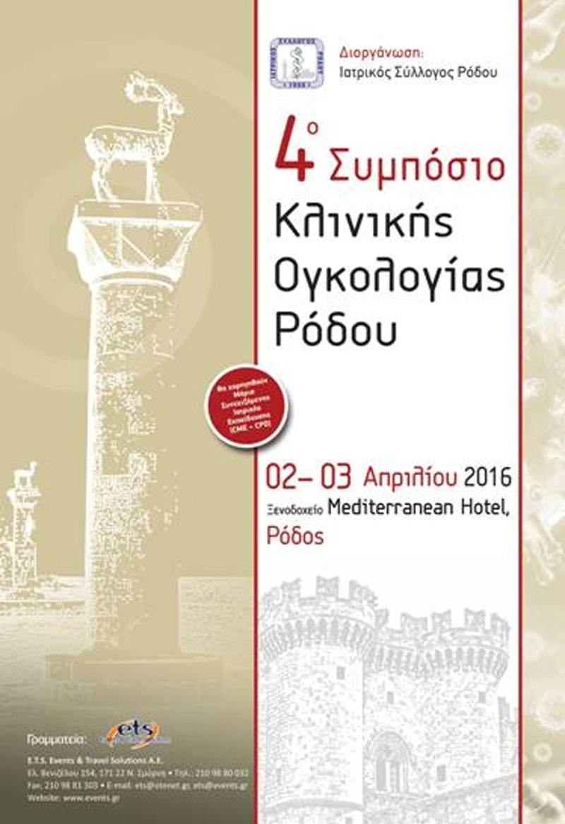 Θα θέλαμε να σας ενημερώσουμε για τη διεξαγωγή του «4ου Συμποσίου Κλινικής Ογκολογίας Ρόδου», που διοργανώνεται από τον Ιατρικό Σύλλογο Ρόδου, και θα διεξαχθεί στις 2-3 Απριλίου 2016 στη Ρόδο, στο Ξενοδοχείο Mediterranean Hotel, παρακαλώ όπως βρείτε συνημμένα την αφίσα του συνεδρίου.