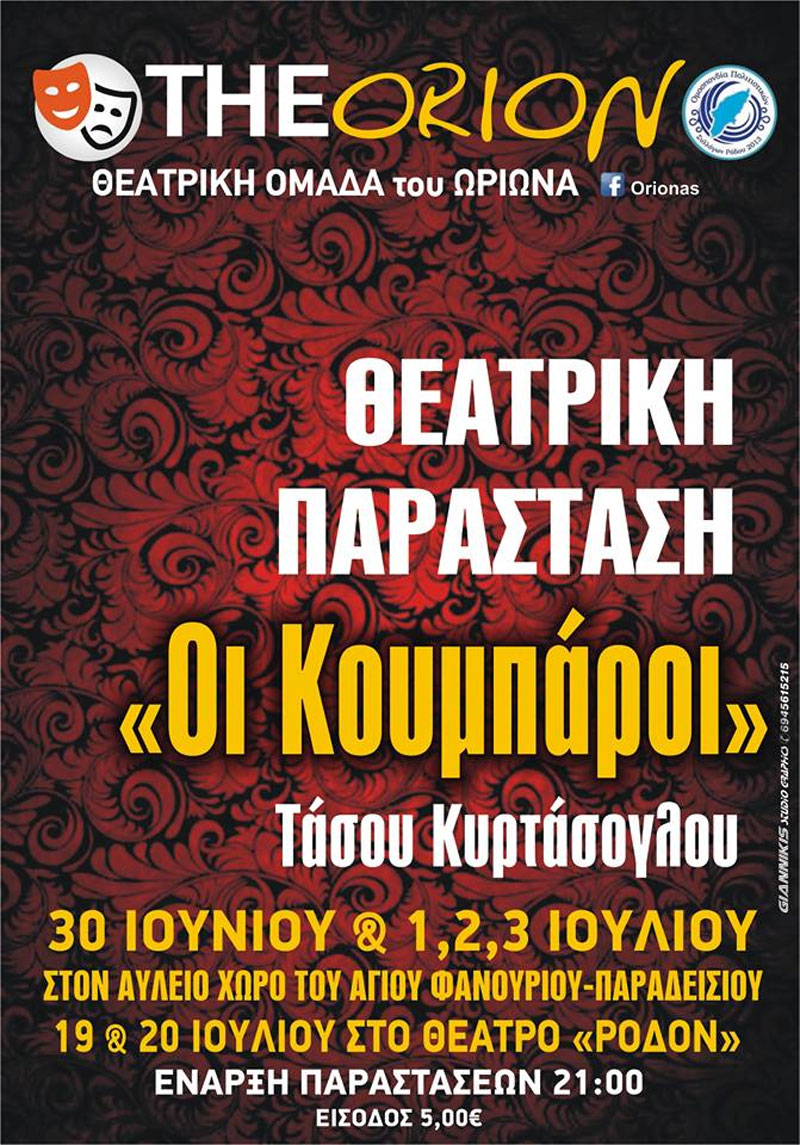 Η ομάδα THEORION του συλλόγου νέων Παραδεισίου Ωρίωνας ανοίγει και πάλι την αυλαία της με το θεατρικό έργο του δικού μας Τάσου Κυρτασόγλου <<ΟΙ ΚΟΥΜΠΑΡΟΙ>>. “Μία σύγχρονη κωμωδία για την Ελλάδα του σήμερα, μέσα από την καθημερινή αναζήτηση της ευτυχίας. Δύο χωρισμένα ζευγάρια (οι κουμπάροι), δύο χήρες, δύο επίδοξοι γαμπροί και μια τσαχπίνα γειτόνισσα, μα και μία πλασιέ με το βοηθό της, μπλέκουν σε ξεκαρδιστικές καταστάσεις με κοινωνικές προεκτάσεις και άρωμα πολιτικής σάτιρας. Α, να μην ξεχάσουμε και το φάντασμα!”