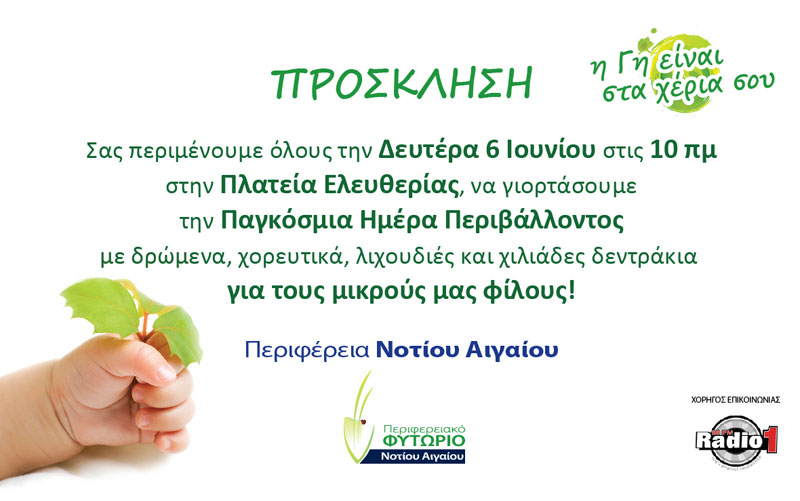 Με αφορμή την Παγκόσμια Ημέρα Περιβάλλοντος 2016, θα πραγματοποιηθούν οριζόντιες δράσεις και στα 48 νησιά Δωδεκανήσου και Κυκλάδων με κεντρικό σύνθημα «Η γη είναι στα χέρια σου». Στο πλαίσιο αυτό θα δοθούν περισσότερα από 10 χιλιάδες φυτά.