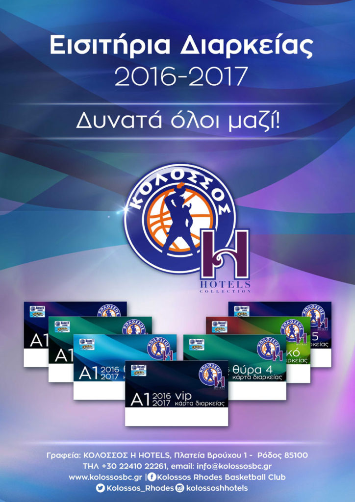 Τα εισιτήρια διαρκείας της ΚΑΕ ΚΟΛΟΣΣΟΣ H HOTELS για την αγωνιστική 2016-17