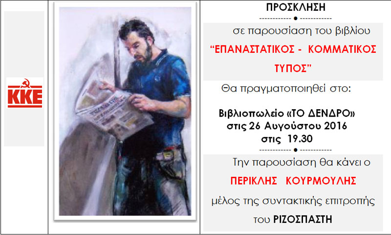 Πρόσκληση σε παρουσίαση του βιβλίου “ΕΠΑΝΑΣΤΑΤΙΚΟΣ – ΚΟΜΜΑΤΙΚΟΣ ΤΥΠΟΣ”