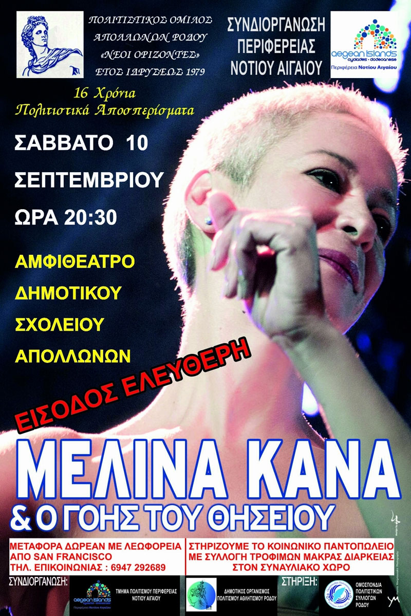 Κορυφαία στιγμή των φετινών εκδηλώσεων η μεγάλη συναυλία της Μελίνας Κανά στο αμφιθέατρο του Δημοτικού Σχολείου Απολλώνων, το Σάββατο 10 Σεπτεμβρίου στις 8:30 μ.μ.