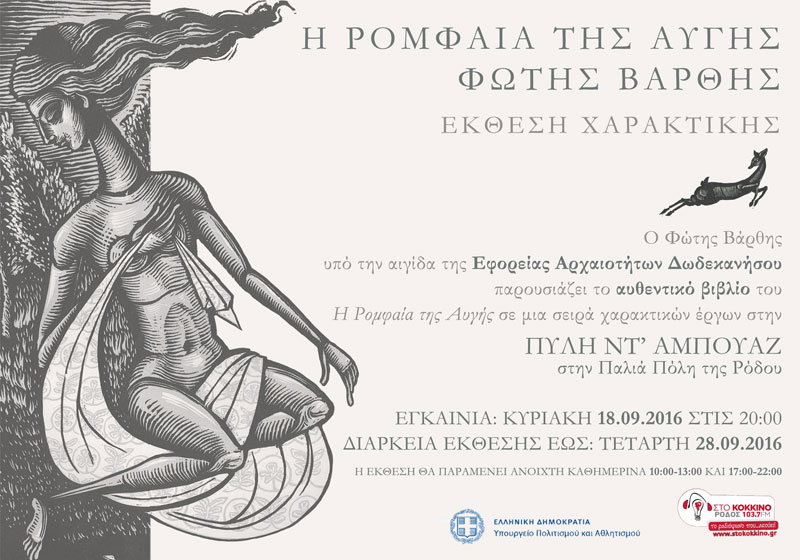 Ο Φώτης Βάρθης παρουσιάζει το αυθεντικό βιβλίο του «Η Ρομφαία της Αυγής» σε μια σειρά χαρακτικών έργων στην Πύλη ντ’ Αμπουάζ στη Μεσαιωνική Πόλη της Ρόδου. Εγκαίνια: Κυριακή 18 Σεπτεμβρίου 2016, στις 20.00 Διάρκεια έκθεσης: 18-28 Σεπτεμβρίου 2016, ώρες λειτουργίας: 10.00-13.00 και 17.00-22.00 Υπό την αιγίδα της Εφορείας Αρχαιοτήτων Δωδεκανήσου – Υπουργείο Πολιτισμού και Αθλητισμού. […]