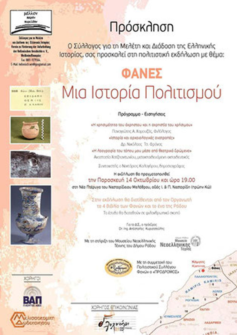 Στην εκδήλωση θα διατίθενται από τον Οργανωτή τα 4 βιβλία των Φανών και το ένα της Ρόδου. Τα έσοδα θα διατεθούν για φιλανθρωπικό σκοπό (Φάνες, Άγιος Ανδρέας).