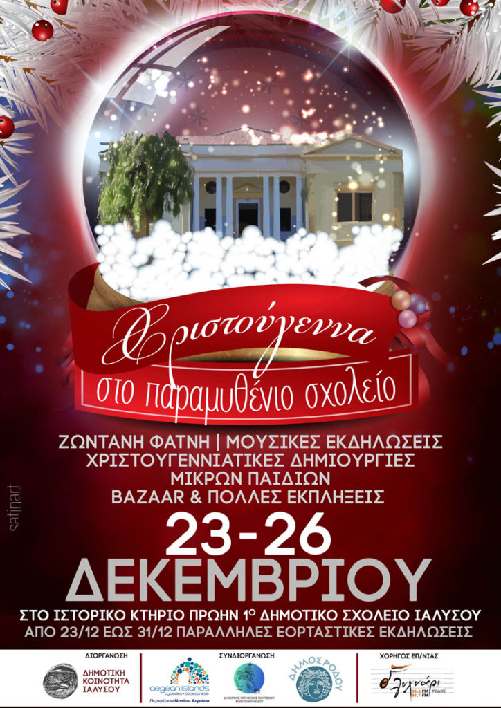 Η Δημοτική Κοινότητα Ιαλυσού σε συνεργασία με την Περιφέρεια Νοτίου Αιγαίου,το Δήμο Ρόδου και το Δ.Ο.Π.Α.Ρ , διοργανώνουν και φέτος χριστουγεννιάτικες εκδηλώσεις με τη λειτουργία ζωντανής Φάτνης από 24-27 Δεκεμβρίου 2016 στο παλιό 1ο Δημοτικό Σχολείο Ιαλυσού. (τελετή έναρξης εκδηλώσεων Σάββατο 24 Δεκεμβρίου και ώρα 18.00) Μπαζάαρ φιλανθρωπικού σκοπού,μουσικές εκδηλώσεις,χριστουγεννιάτικες δημιουργίες μικρών παιδιών,Μάγοι,Ζογκλέρ & πολλές […]