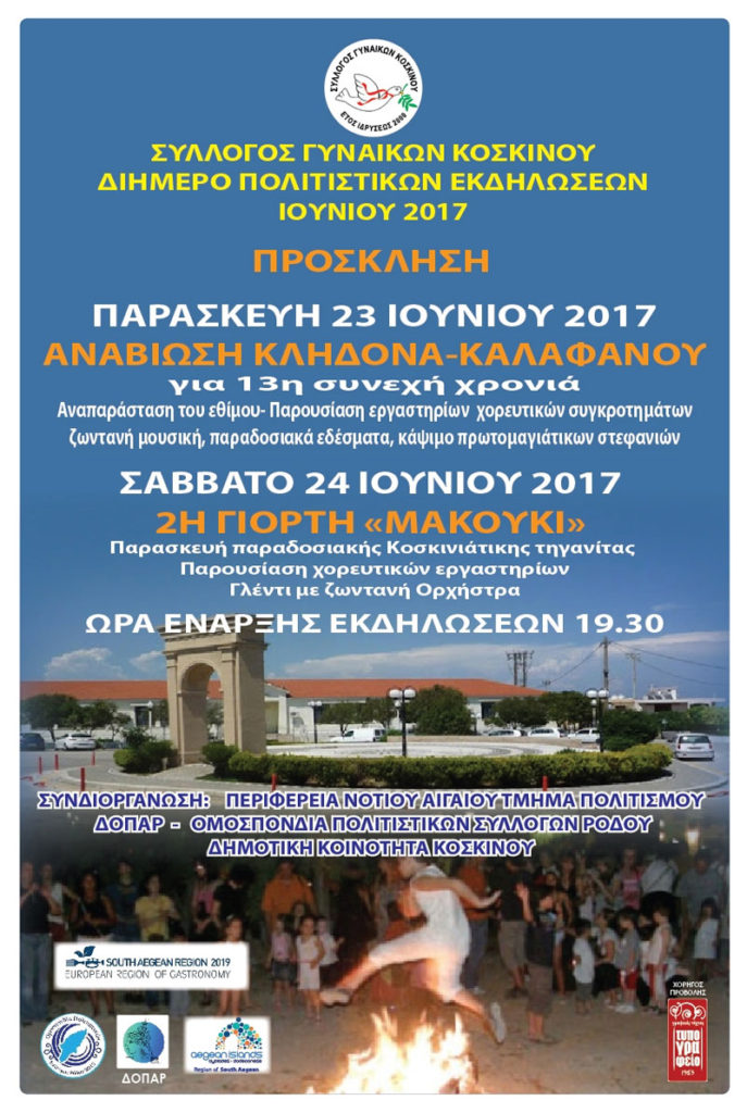 Ο Πολιτιστικός Σύλλογος Γυναικών Κοσκινού,θα πραγματοποιήσει διήμερο εκδηλώσεων στις 23 & 24 Ιουνίου 2017 στην κεντρική πλατεία της Δημοτικής Κοινότητας Κοσκινού. 23 Ιουνίου,19:30 Αναβίωση του εθίμου του Κλήδονα και του Καλαφανού 24 Ιουνίου,19:30 Γιορτή Μακούκι (παραδοσιακή τηγανίτα) Τις εκδηλώσεις θα πλαισιώσουν τα εργαστήρια του συλλόγου,χορευτικά συγκροτήματα, ζωντανή μουσική και θα προσφερθούν παραδοσιακά εδέσματα. Το Πολιτιστικό […]
