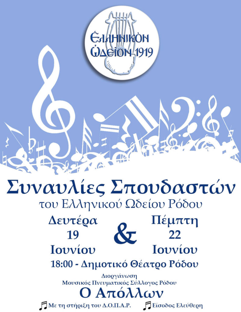 Στις 19 και 22 Ιουνίου 2017,στο Δημοτικό Θέατρο Ρόδου,στις 6 μ.μ. οι σπουδαστές του Ελληνικού Ωδείου κλείνουν με τον πιο μουσικό τρόπο τη σχολική τους χρονιά . Διοργάνωση Μουσικός και Πνευματικός Σύλλογος ΑΠΟΛΛΩΝ. Με τη στήριξη του Δήμου Ρόδου – Δ.Ο.Π.Α.Ρ. Είσοδος Ελεύθερη.