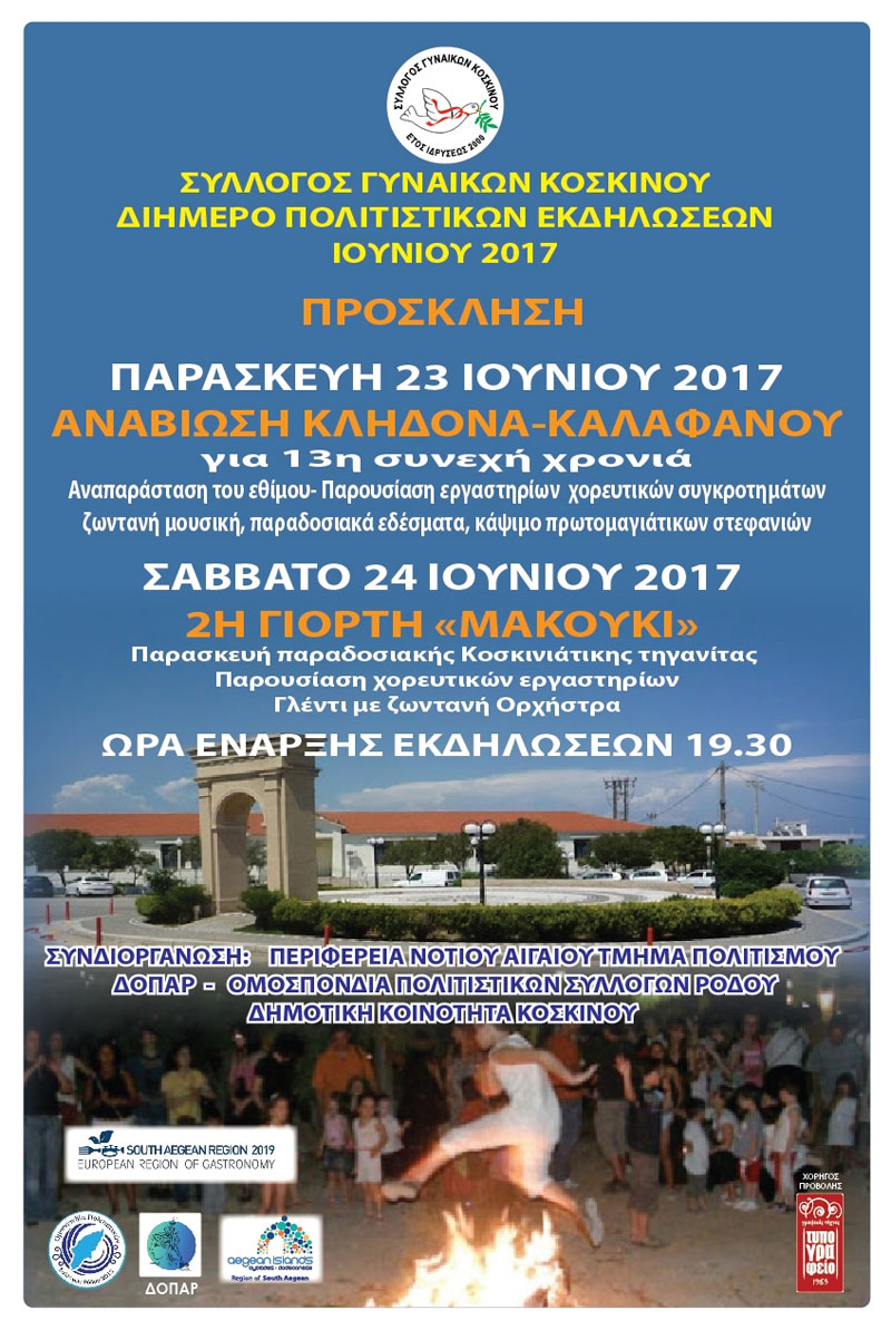 Ο Πολιτιστικός Σύλλογος Γυναικών Κοσκινού,θα πραγματοποιήσει διήμερο εκδηλώσεων στις 23 & 24 Ιουνίου 2017 στην κεντρική πλατεία της Δημοτικής Κοινότητας Κοσκινού.