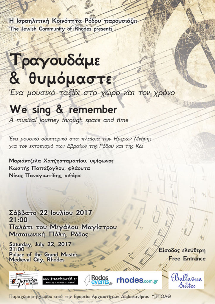 Η Ισραηλιτική Κοινότητα Ρόδου, στα πλαίσια των Ημερών Μνήμης για τον εκτοπισμό των Εβραίων της Ρόδου και της Κω πραγματοποιεί μία μοναδική μουσική εκδήλωση στον Αύλειο Χώρο του Παλατιού του Μεγάλου Μαγίστρου και την προβολή της καθηλωτικής ταινίας “Το Κύμα” στο Θερινό Κινηματοθέατρον Ρόδον. Το Σάββατο, 22 Ιουλίου 2017, στις 21:00, στον μαγευτικό χώρο του […]