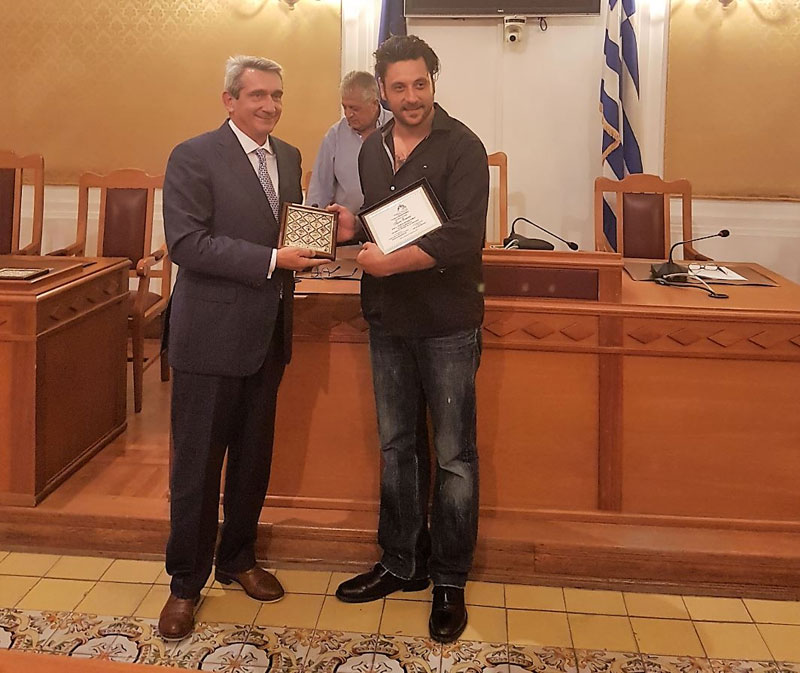 Επίσης, ο Εντεταλμένος Πολιτισμού Δωδεκανήσου, Κάλλιστος Διακογεωργίου, τίμησε τον ηθοποιό Μάκη Παπαδημητρίου, που μαζί με τον Γιώργο Χρυσοστόμου, βρίσκονται στη Ρόδο, για να ανεβάσουν την επιτυχημένη θεατρική παράσταση «Πέτρες στις τσέπες του», την προσεχή Παρασκευή, στο Θέατρο Μεσαιωνικής Τάφρου.