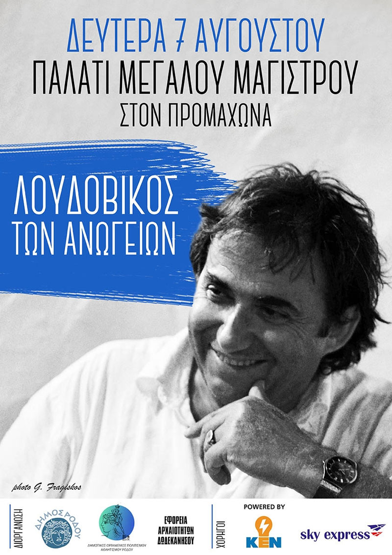 Ο Δήμος Ρόδου-ΔΟΠΑΡ σε συνεργασία με την «Εφορεία Αρχαιοτήτων Δωδ/σου», σας καλούν να απολαύσετε το Αυγουστιάτικο φεγγάρι με συνοδεία την μουσική και τα τραγούδια του Λουδοβίκου των Ανωγείων και της μπάντας του. Μια μοναδική βραδιά με μια μοναδική συναυλία, στον λουσμένο στο φως του φεγγαριού Προμαχώνα του Παλατιού του Μεγάλου Μαγίστρου.