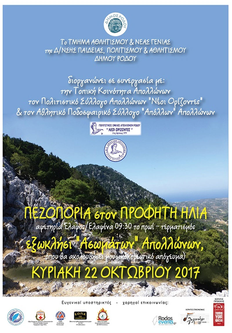 Το Τμήμα Αθλητισμού & Νέας Γενιάς, της Δ/νσης Παιδείας, Πολιτισμού & Αθλητισμού Δήμου Ρόδου, σας ενημερώνει εκ νέου ότι μια σπάνιας ομορφιάς πεζοπορική διαδρομή, 7 χλμ. περίπου, θα πραγματοποιηθεί την Κυριακή 22 Οκτωβρίου 2017, στον ευρύτερο περιβάλλοντα χώρο του Προφήτη Ηλία, με εκκίνηση στις 09:30 το πρωί, από το ΕΛΑΦΟΣ/ΕΛΑΦΙΝΑ, σταθμούς την θέση «ΕΦΤΑΠΟΡΤΗ», τις παλαιές ιταλικές στρατιωτικές εγκαταστάσεις στην περιοχή της «ΑΓΙΑΣ ΕΙΡΗΝΗΣ» και τερματισμό το εξωκλήσι των «ΑΣΩΜΑΤΩΝ» Απολλώνων, όπου θα λάβει χώρα μουσικοχορευτικό απόγευμα, με την συνεργασία της Τοπικής Κοινότητας Απολλώνων, του Πολιτιστικού Συλλόγου Απολλώνων «Νέοι Ορίζοντες», του Αθλητικού Ποδοσφαιρικού Συλλόγου «Απόλλων» Απολλώνων, της τοπικής Εκκλησιαστικής Επιτροπής, της Δ/νσης και του Συλλόγου Γονέων & Κηδεμόνων του Δημοτικού Σχολείου Απολλώνων, καθώς και με την αρωγή της Ομοσπονδίας Πολιτιστικών Συλλόγων Ρόδου.