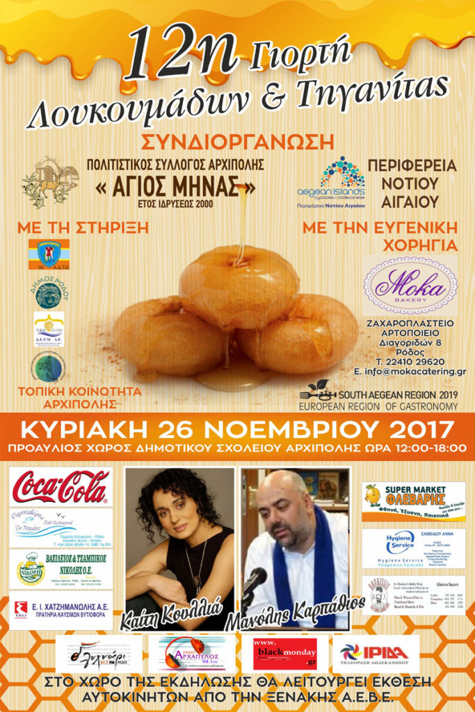 Για 12η χρονιά ο Πολιτιστικός Σύλλογος Αρχίπολης «’Άγιος Μηνάς» συνδιοργανώνει με τον Δήμο Ρόδου – Δ.Ο.Π.Α.Ρ. και την Περιφέρεια Νοτίου Αιγαίου την « Γιορτή Λουκουμάδων και Τηγανίτας», την Κυριακή 26 Νοεμβρίου, στον προαύλιο χώρο του Δημοτικού Σχολείου Αρχίπολης, ώρα 12:00-18:00. Η γιορτή πραγματοποιείται με τη στήριξη της Δ.Ε.Ρ.Μ.Α.Ε., της Τοπικής Κοινότητας Αρχίπολης και της 95 ΑΔΤΕ. […]