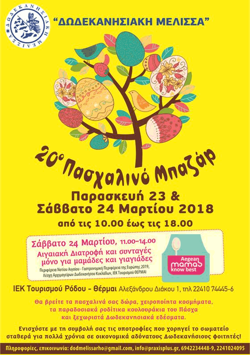 Ολοκληρώθηκαν οι ετοιμασίες για το Πασχαλιάτικο Μπαζάρ της Δωδεκανησιακής Μέλισσας που θα πραγματοποιηθεί Παρασκευή 23 και Σάββατο 24 Μαρτίου 2018 στο ΘΕΡΜΑΙ, στους χώρους του ΙΕΚ ΤΟΥΡΙΣΜΟΥ, Αλεξάνδρου Διάκου 1, από 10.00 -18.00.
