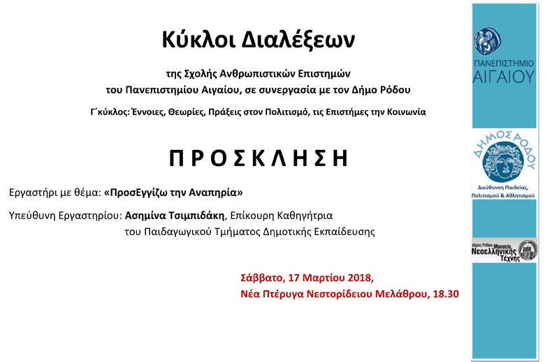 Πραγματοποιήθηκε τo Σάββατο 21 Απριλίου 2018 στη Νέα Πτέρυγα του Νεστορίδειου Μελάθρου, η τρίτη συνάντηση του Γ΄ Κύκλου Διαλέξεων που διοργανώνονται με τη συνεργασία της Σχολής Ανθρωπιστικών Επιστημών του Πανεπιστημίου Αιγαίου και της Δ/νσης Παιδείας, Πολιτισμού και Αθλητισμού του Δήμου Ρόδου.