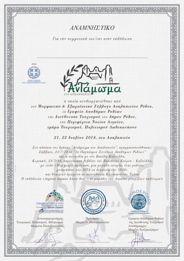 Πραγματοποιήθηκε, το 1ο Παγκόσμιο Συνέδριο Αποδήμων Ροδίων στην Τοπική Κοινότητα Ασκληπιείου, το Σάββατο 21/22 Ιουλίου 2018, που συνδιοργάνωσαν ο Δήμος Ρόδου (Γραφείο Αποδήμων Ροδίων της Διεύθυνσης Τουρισμού), η Περιφέρεια Νοτίου Αιγαίου (Tμήμα Τουρισμού, Πολιτισμού Δωδεκανήσου), η Ιερά Μητρόπολη Ρόδου, ο Μορφωτικός και Εξωραϊστικός Σύλλογος Ασκληπιείου, σε συνεργασία με τους Παρροδιακούς Συλλόγους Αποδήμων Ροδίων, την Ιερά […]