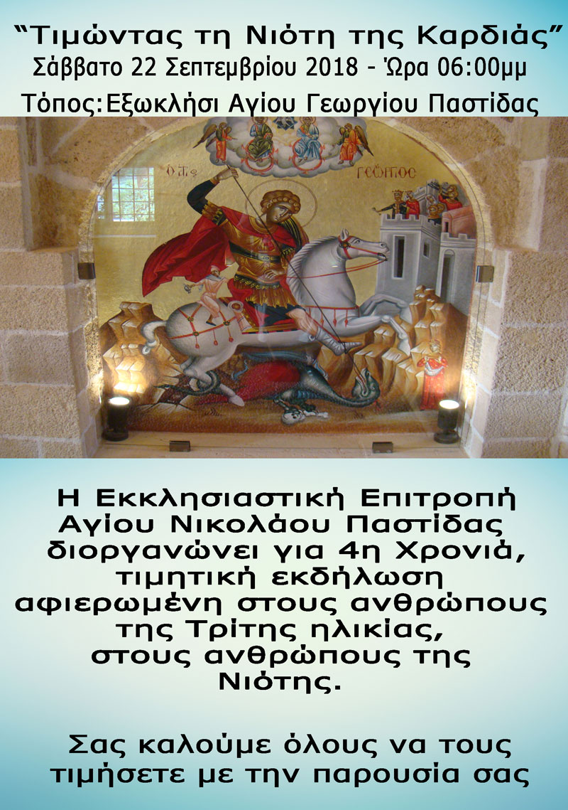 Το Σάββατο 22 Σεπτεμβρίου 2018 και ώρα 18:00 στο εξωκλήσι του Αγίου Γεωργίου στην Παστίδα, η Εκκλησιαστική Επιτροπή του Ενοριακού Ναού Αγίου Νικολάου διοργανώνει τιμητική εκδήλωση με τίτλο «Τιμώντας τη Νιότη της Καρδιάς» αφιερωμένη στους ανθρώπους της τρίτης ηλικίας που η προσφορά τους στην κοινωνία μας, ήταν είναι και θα είναι ανεκτίμητη.