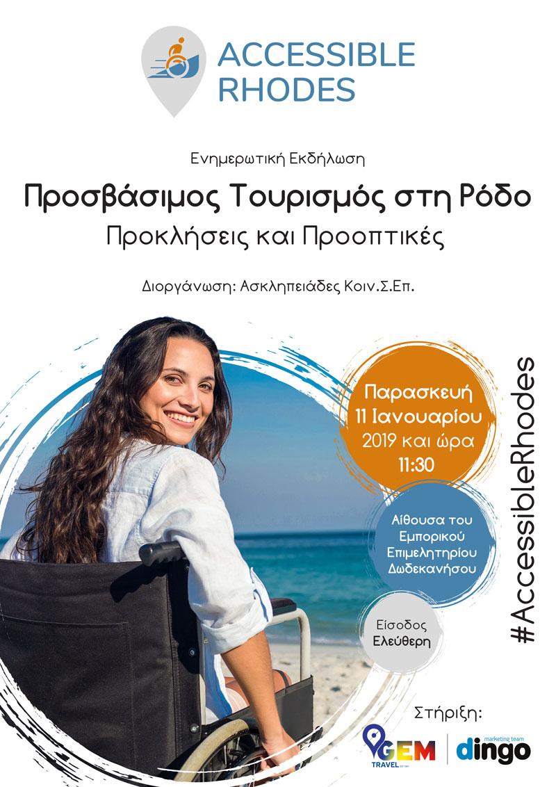 Η «Ασκληπειάδες Κοιν.Σ.Επ.», διοργανώνει ενημερωτική εκδήλωση με θέμα «Προσβάσιμος Τουρισμός στη Ρόδο – Προκλήσεις και Προοπτικές» την Παρασκευή 11 Ιανουαρίου 2019 και ώρα 11:30 στην αίθουσα του Εμπορικού Επιμελητηρίου Δωδεκανήσου με ελεύθερη είσοδο.