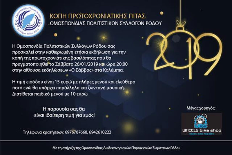 Η Ομοσπονδία Πολιτιστικών Συλλόγων Ρόδου σας προσκαλεί στην καθιερωμένη εκδήλωση για την κοπή της πρωτοχρονιάτικης βασιλόπιτας που θα πραγματοποιηθεί το Σάββατο 26/01/2019 και ώρα 20:00 στην αίθουσα εκδηλώσεων “Ο Σάββας” στα Κολύμπια.