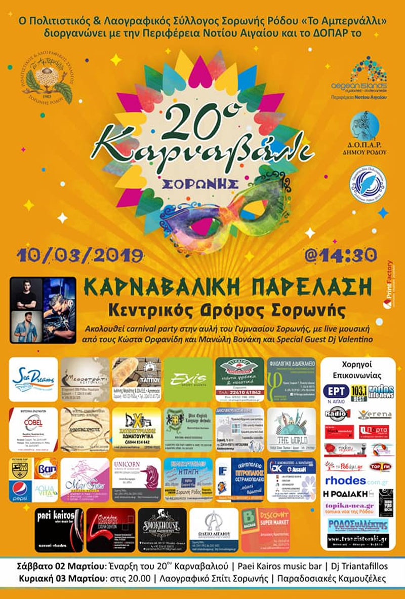 Ο Πολιτιστικός και Λαογραφικός Σύλλογος Σορωνής Ρόδου ‘Το Αμπερνάλλι’ διοργανωτής του καρναβαλιού όλα αυτά τα χρόνια, έχει στο πλευρό του για ακόμη μια φορά την Περιφέρεια Νοτίου Αιγαίου και τον εντεταλμένο στον Πολιτισμό Περιφερειακό Σύμβουλο κ. Κάλλιστο Διακογεωργίου, ο οποίος είναι πάντα πρόθυμος για τη στήριξη των δράσεων του Συλλόγου. Συνδιοργανωτής επίσης και φέτος, ο Δημοτικός Οργανισμός Πολιτισμού και Αθλητισμού Δήμου Ρόδου.